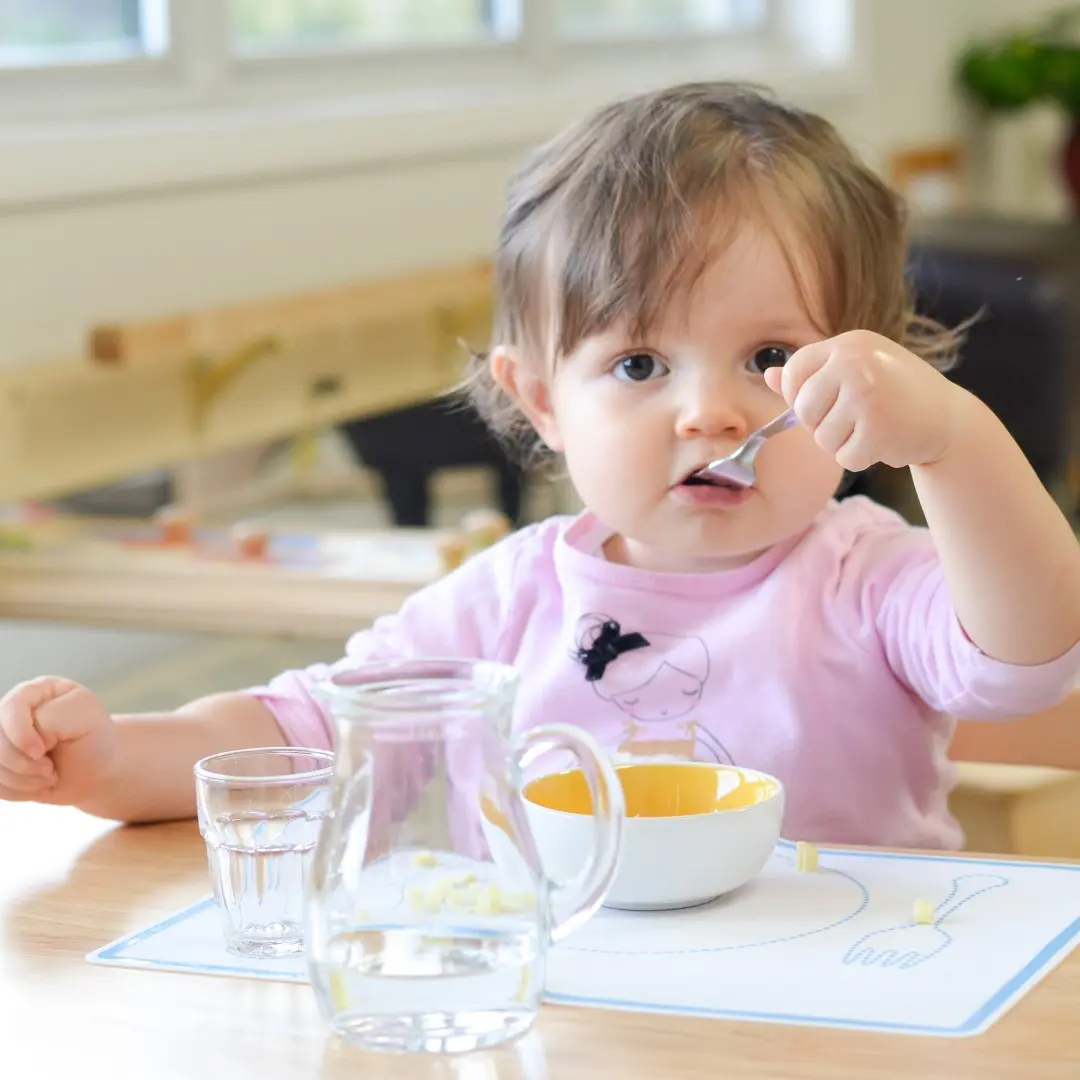 - Drinking from an open glass & eating with child-sized silverware