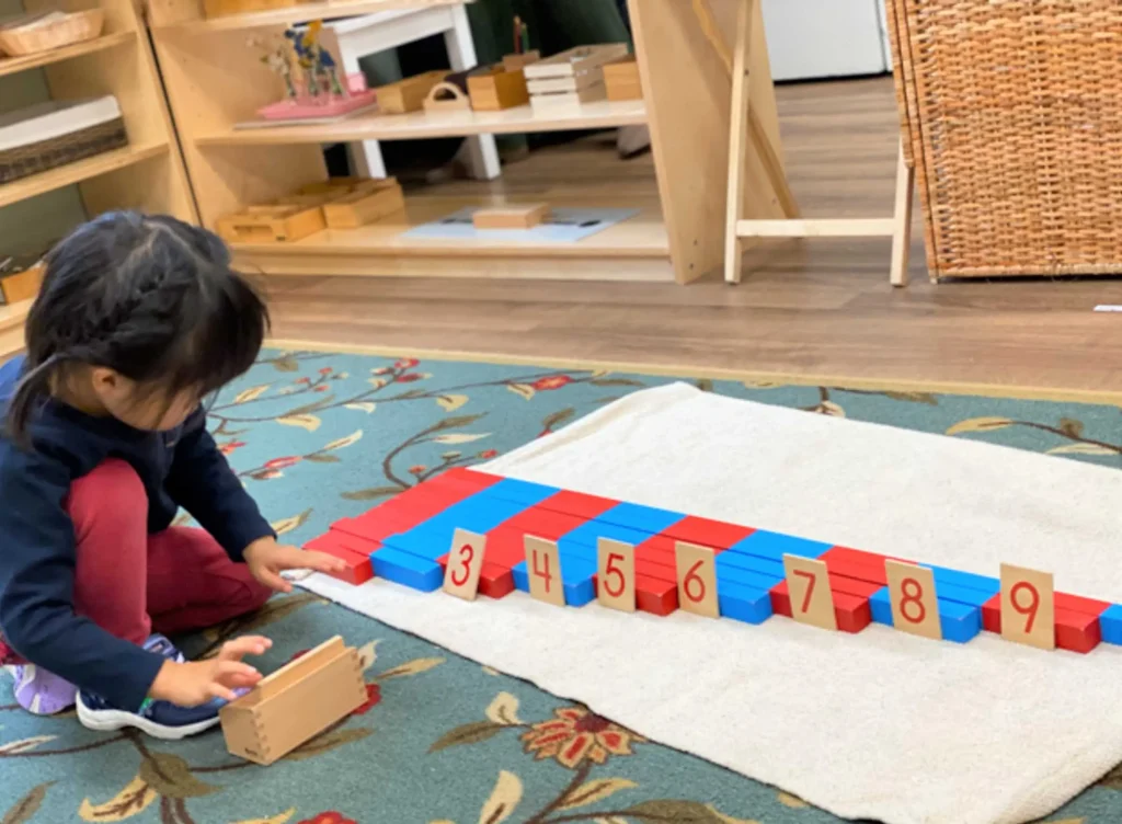Montessori learning environments take a unique approach to teaching math: The carefully designed math materials take an abstract concept, such as “length,” and make it into concrete materials that children can hold in their hands. The Number Rods help a child begin his understanding of the numbers 1 through 10.