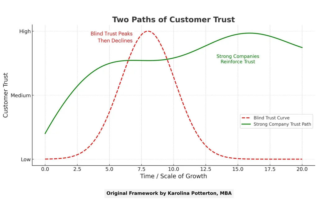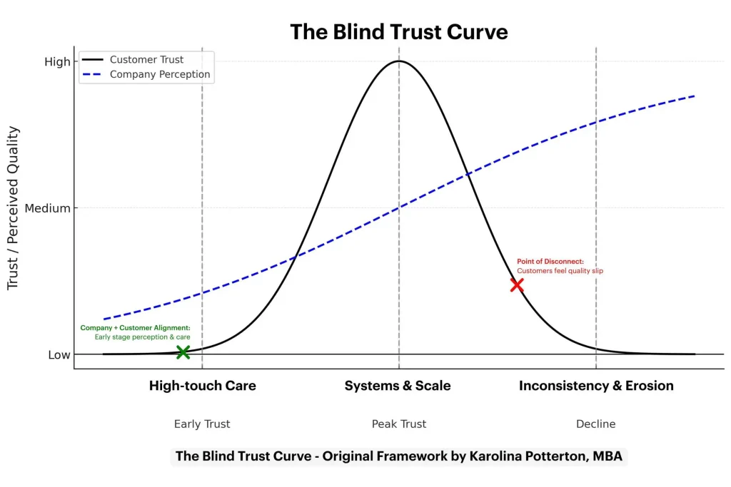 At first, it rises quickly. Parents forgive imperfections because they see care. Then scale arrives. Systems grow. The brand feels bigger. Trust seems to peak.