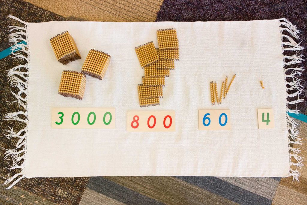 From there, the child continues to use “the bank” and cards to learn the foundation of operations. The guide will work with multiple children at once, for example, asking each to bring a really big number, counting all the beads together, creating the new number with cards, and then, putting them all together to make really big new number, which they learn is called addition.