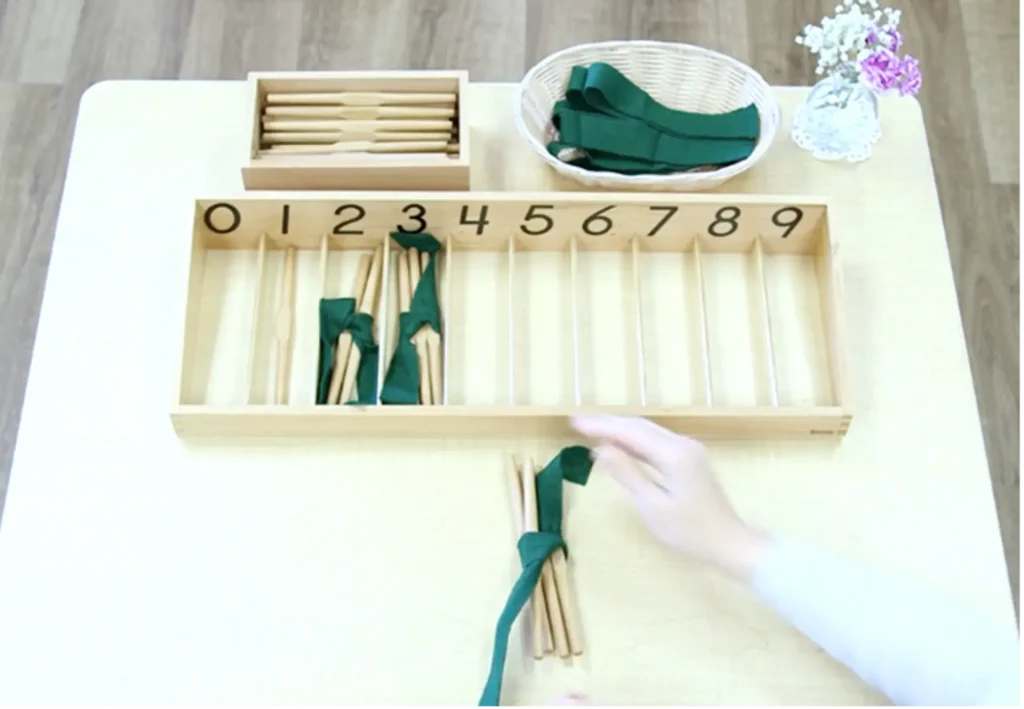Once the child has a physical understanding of these numbers from using the golden beads, knows the symbols using the color-coded cards, and has associated the two together, she begins a series of engaging activities.