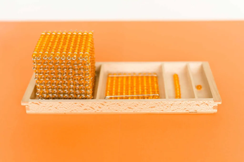 Just as the child learned her first quantities using materials that clearly demonstrated their relationships, she now uses materials that ingrain the relationships and significance of place value in order to understand the decimal system.