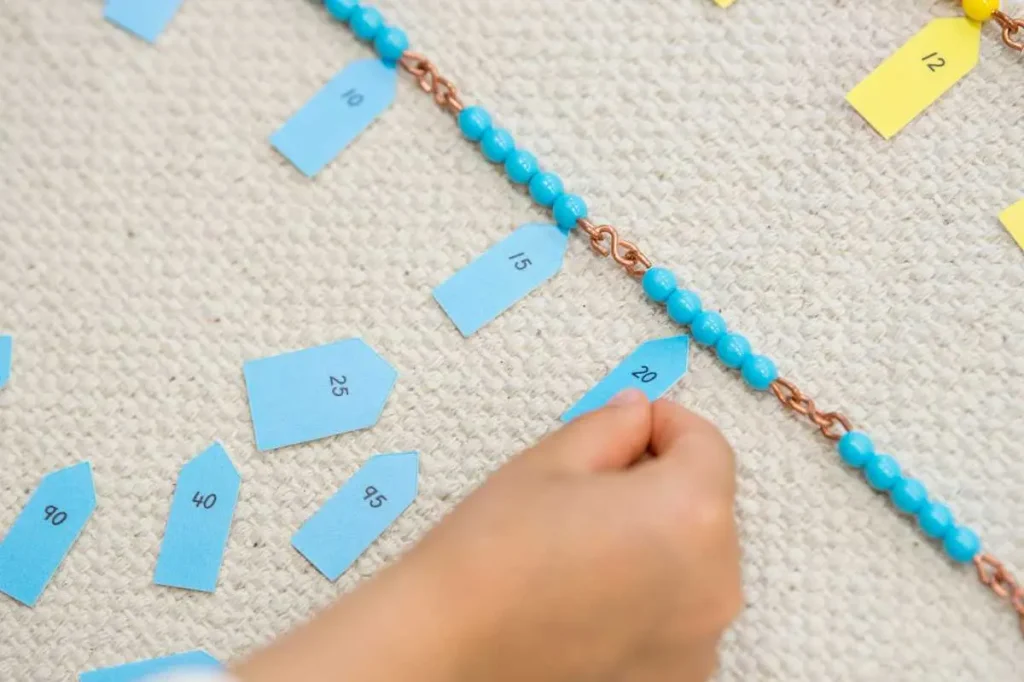 To fuel the child’s fire for counting, he is first presented with a series of beads and corresponding labels. There is the hundred chain, for example, which contains 10 sets of 10 beads which are connected together at the ends forming one long chain. There is also the thousand chain which contains 100 sets of 10 beads connected together.