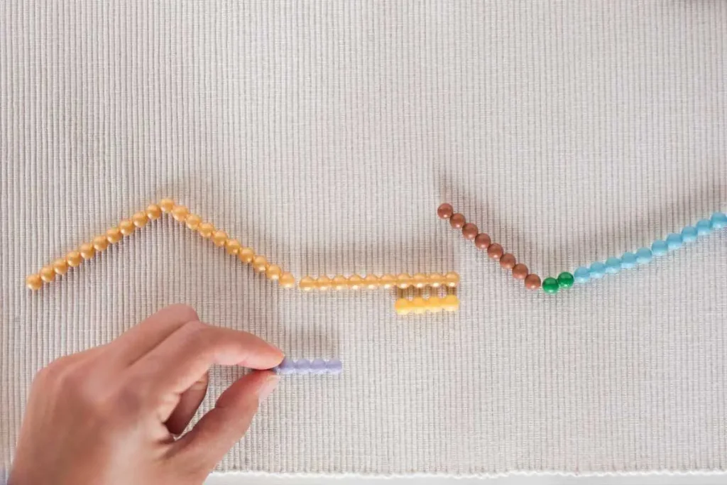 She starts with perhaps the most iconic Montessori math material: the Golden Beads.