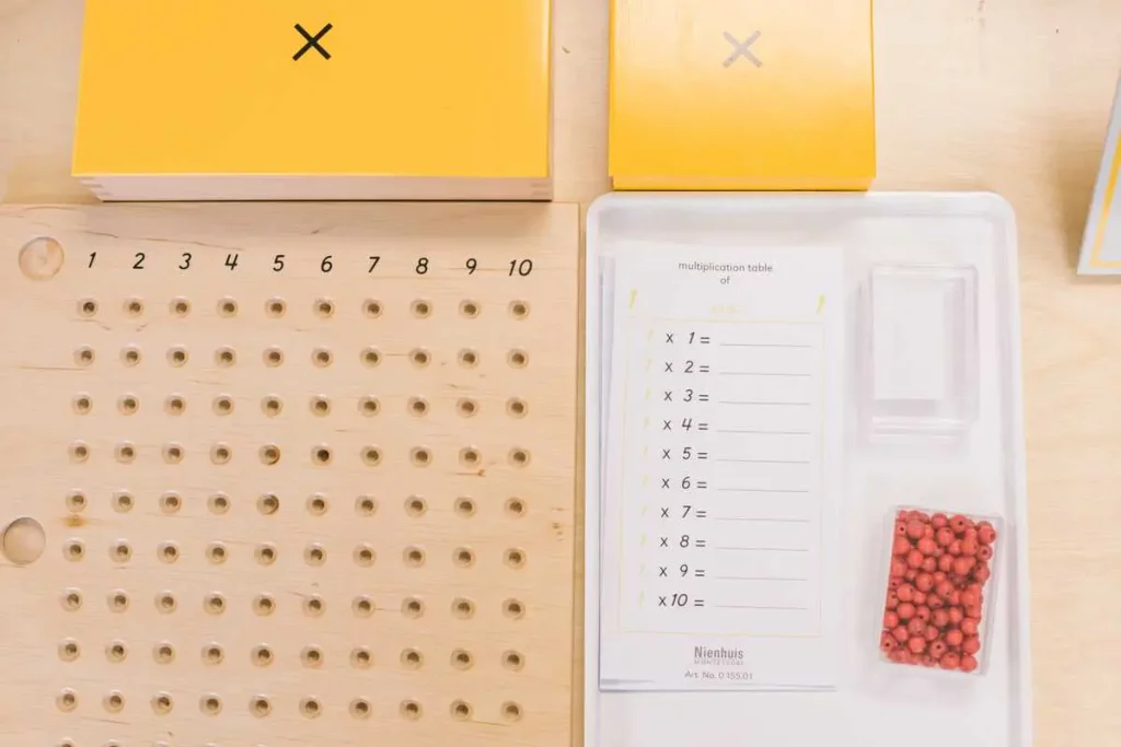 In parallel with her work on addition and subtraction, the child begins memorizing her multiplication and division tables using the multiplication and division boards.