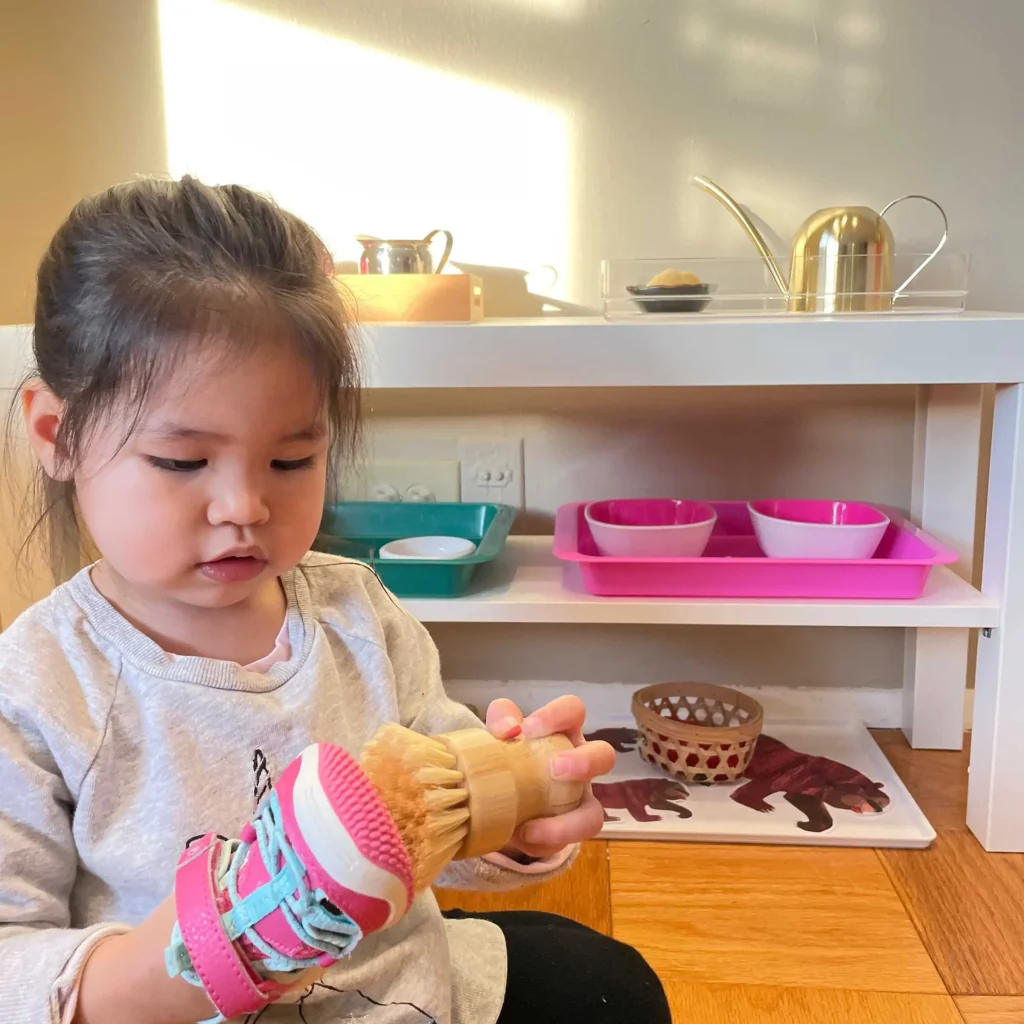 We’re going to share what you need to know to make Montessori at home affordable and straightforward. It’s important to note that Montessori at home is a whole home project. Each room should be organized so that every member of the household can be as independent as possible. The inner discipline of the child that Dr. Montessori described is developed through Practical Life activities, including personal hygiene, cleaning up after meals, and taking care of their belongings and the belongings of the family.