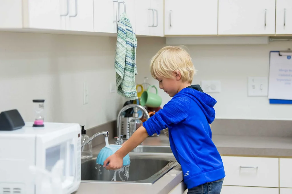 - Cleaning cloths should be accessible so your child can clean up after they’re finished with a meal or snack. This gives children the space to develop a sense of care and stewardship over their environment.