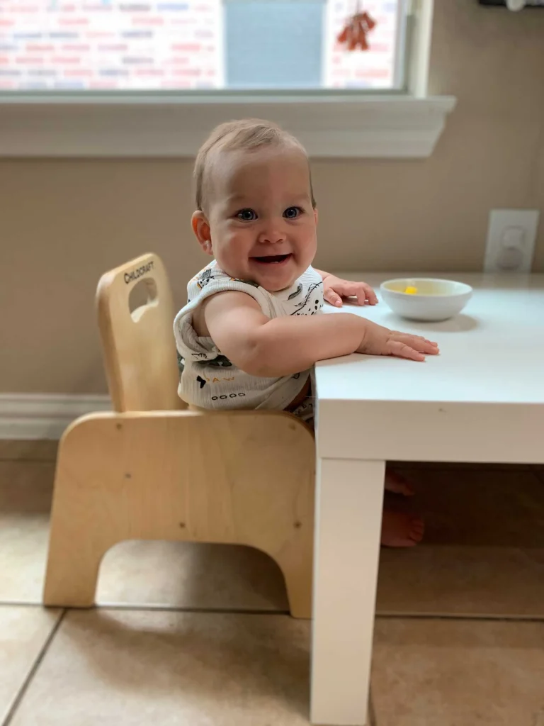 Booster seats and high chairs don’t allow children to move freely. A child-sized chair and table lets them enjoy their meal in the same way older children and adults do at their table. The freedom to move then gives them the chance to clear their plate and tableware.