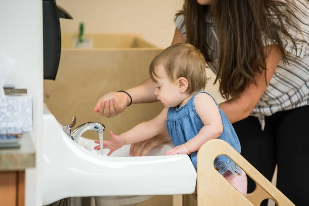 Instead of toilet training in the traditional sense, Montessori parents use potty learning to build confidence in their children. Your Montessori bathroom already has the core items – a stool to reach the vanity and possibly a faucet extender. For potty learning, introduce a small potty or child toilet seat that your toddler can use independently.