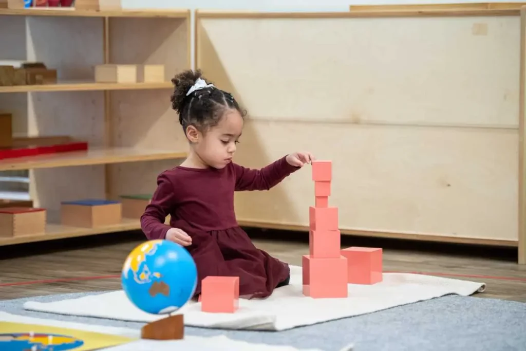 The pink tower, for example, is an engaging puzzle scientifically designed to captivate the child and impart crucial math concepts. It consists of a set of pink, wooden blocks that increase in size by 1 cm along each dimension, so that the size of the first block is 1 cubic centimeter and the 10th is 1000 cubic centimeters.