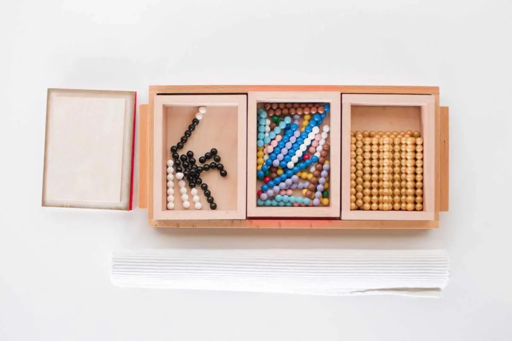 To fuel the child’s fire for counting, he is first presented with a series of beads and corresponding labels. There is the hundred chain, for example, which contains 10 sets of 10 beads which are connected together at the ends forming one long chain. There is also the thousand chain which contains 100 sets of 10 beads connected together.